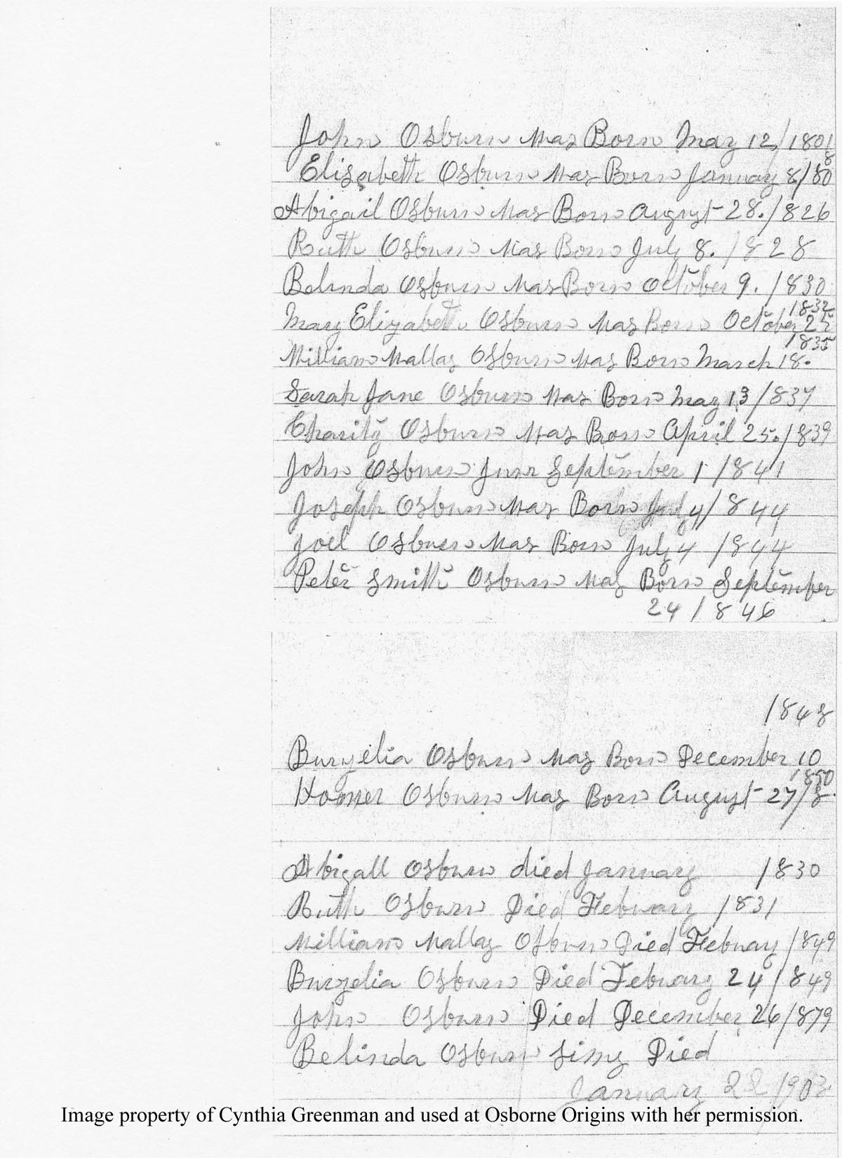 1. Abigail Osburn b 28 Aug 1826, d Jan 1830